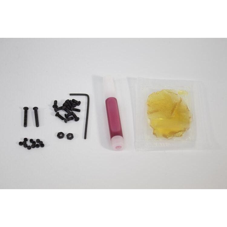 A packet of grease, thread locker, 1.5mm hex driver, some set screws, and 2.5mm screws.