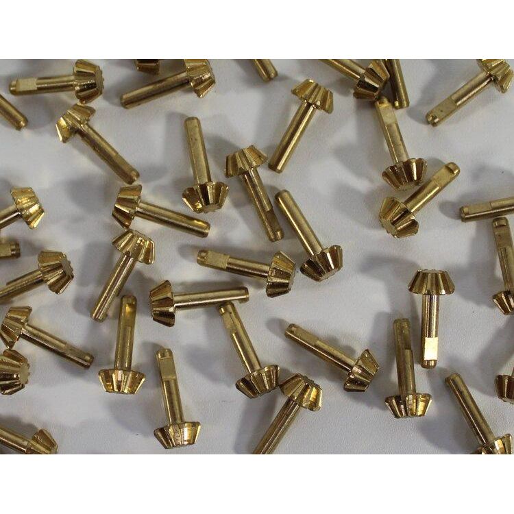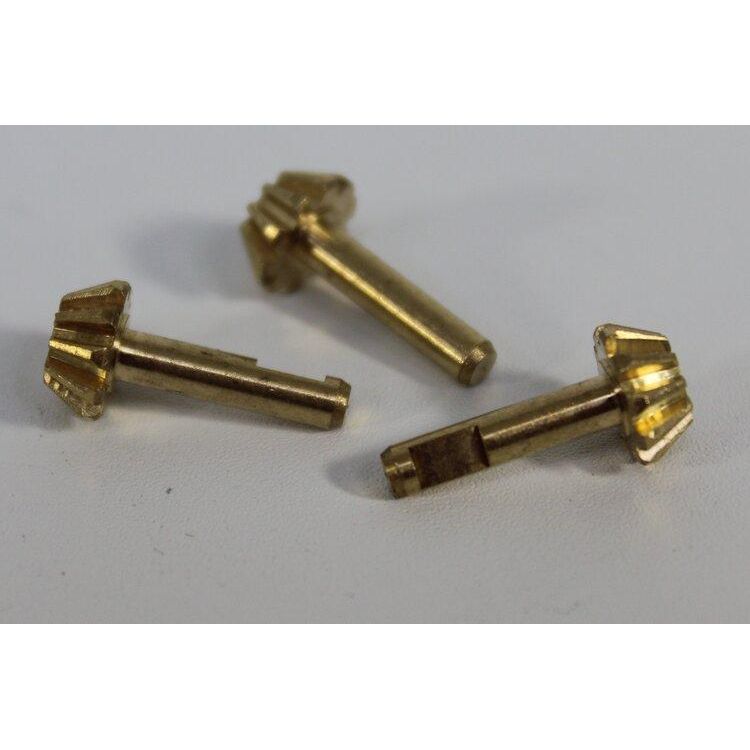 A brass pinion gear for the 1/16th scale trucks. This pinion gear is required to upgrade the gearbox as it allows a metal transmission shaft to be used on this.